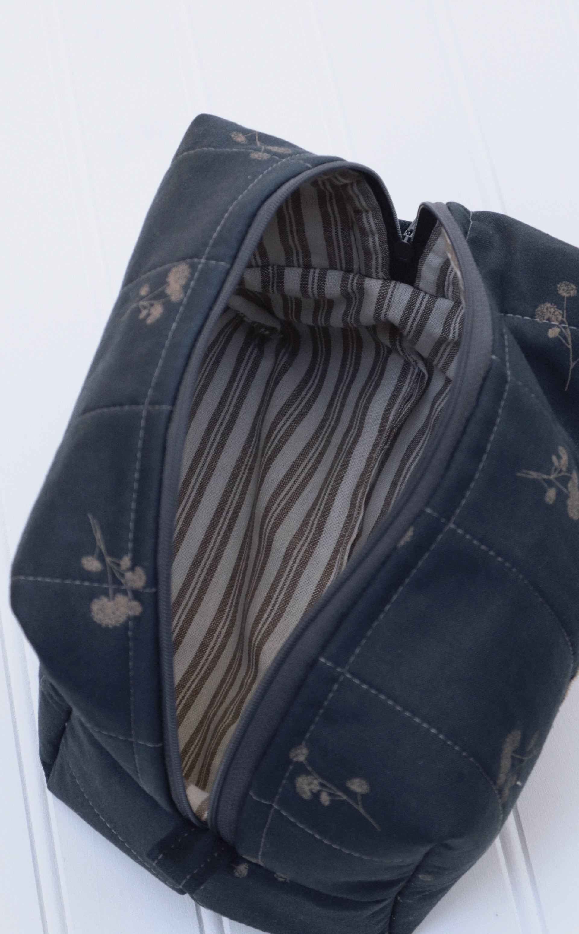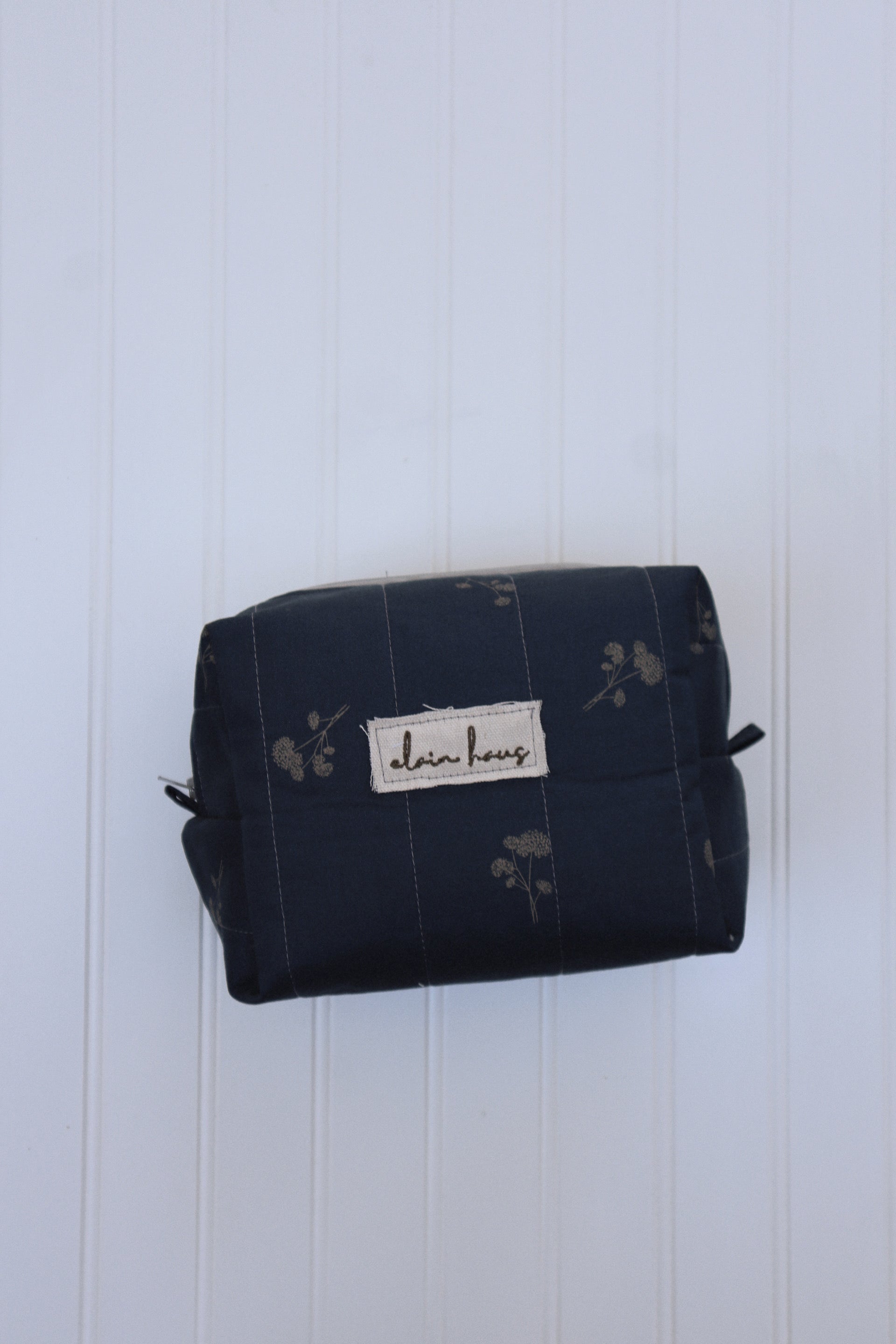 Handmade with care, this Navy Blue Floral Toiletry Bag adds a touch of elegance to your everyday routine. The durable cotton fabric features a classic floral pattern in rich navy tones, complemented by a beige and grey striped inner lining for a charming contrast. With its boxy shape and secure zipper closure, it’s the perfect size for organizing makeup, skincare, and travel essentials. A practical yet stylish bag you’ll reach for daily.